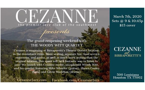 Calendar of Events at Cezanne Jazz Club of Houston Texas. Touted as one of Houstons best jazz clubs this snug but comfortable space resides above the Black Labrador pub near the intersection of Richmond and Montrose. Buy tickets for an upcoming concert at Cezanne Jazz Club.